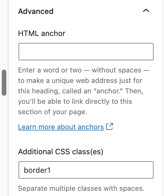 To begin, let's start with stating what we want: I want the site to add a border whenever I put {a custom class name I make up} into a block's "Advanced > Additional CSS class(es)" field. Let's name this custom class "border1" and put it into the field: