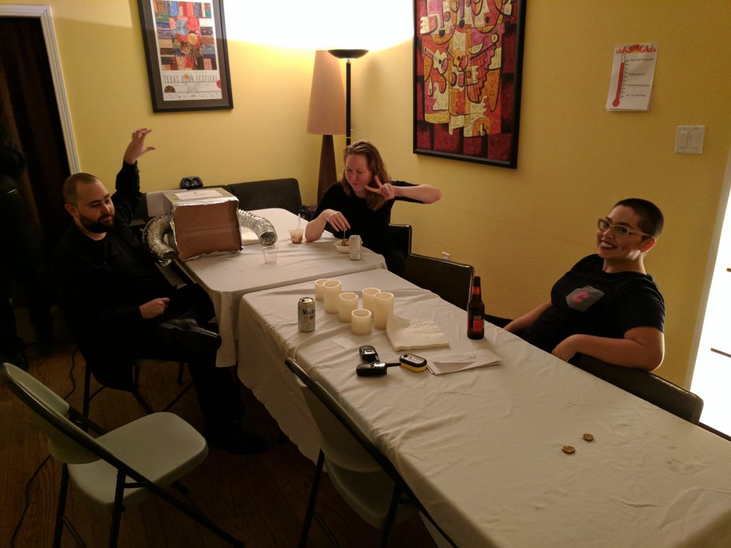 I wanted to have the ability to make all the lights in the house to go off in an instant. This required a lot of extension cords, which led into what came to be known as “The Control Room”. There were also lots of cables going to various speakers around the living room. This way we could pipe in the laugh tracks and background noise. It was surprising how effective playing some “dining room chatter” tracks will get people to start talking. The off-beat laughter (controlled by maestro Andy) was timing-perfect and triggered its own laughter. The Control Room in this first iteration of Curious Dinners was just a couple computes and a couple power strips to “turn off” the lights.