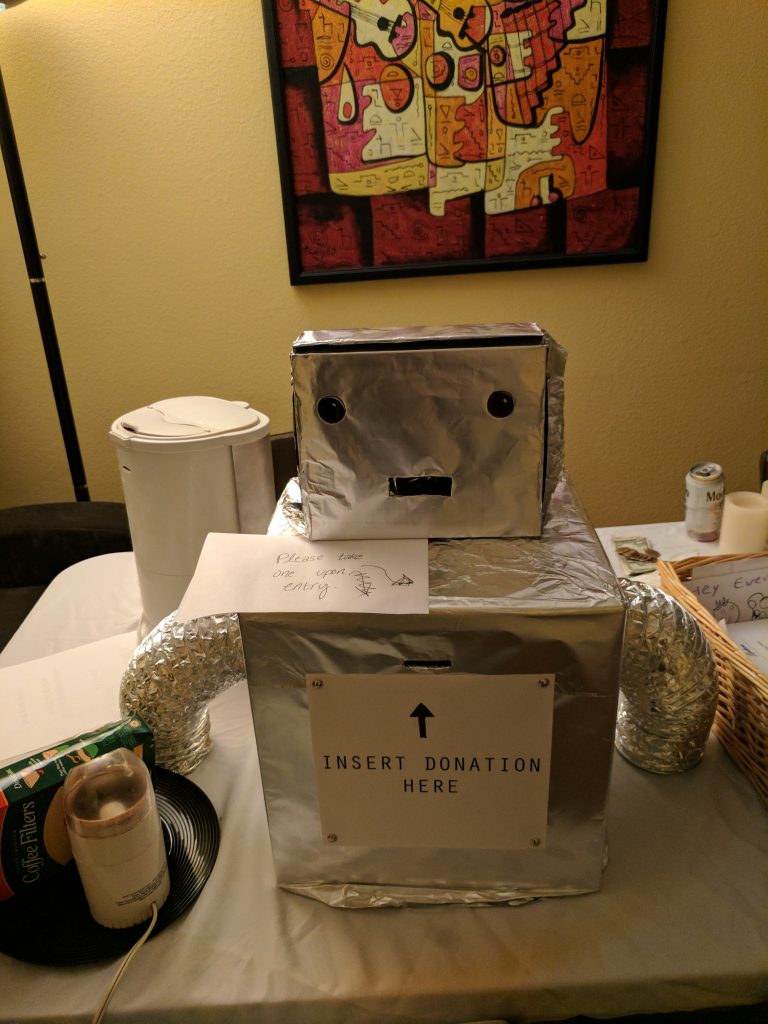 The robot out front had a walkie talkie stuffed into him so that we could talk with guests as if we were the robot. We didn’t think this all the way through though: since the robot's walkie talkie was hiden inside his guts, the guests couldn’t press the button to talk back to us. As a result, we didn’t know when they had said something. It was janky but they got the point.