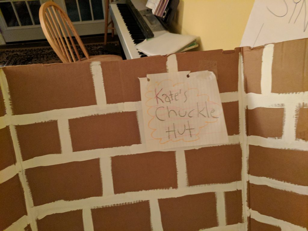 While everyone is eating, silverware people come out and set up what looks to be a fake brick wall and sign that says “Kate’s Chuckle Hut”.