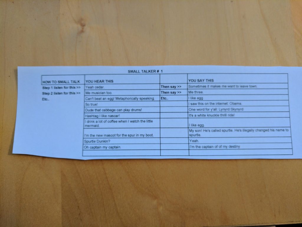 She indicates that she has a fix for that. Small talk has been prepared for the guests to participate in.