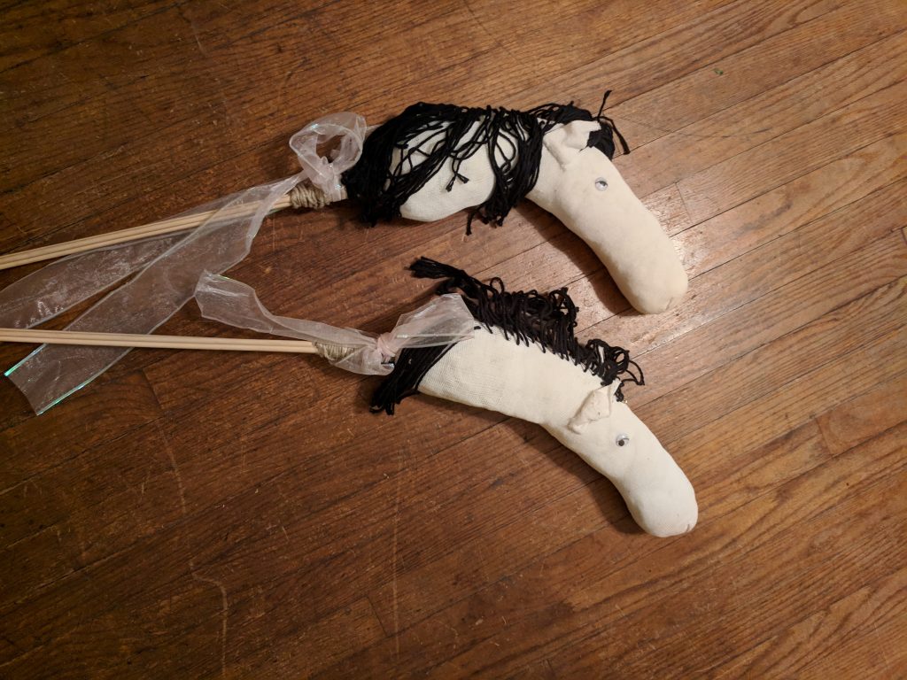 As everyone is eating, two people with shields and swords come out on horses made out of white tube socks and have a short jousting match. When the jousting is over, guests are invited to line up and pet the horses. You get in line excitedly.