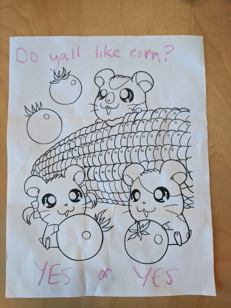 You arrive at my house and walk up the porch steps. There is a small robot waiting for you. He appears to be made out of cardboard boxes, flexible ductwork, and aluminum foil. You hear him speak to you through his barely lit mouth: “Please feed me the coins then knock on the door”. You do as he says.