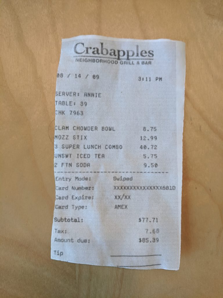 A silverware person then distributes dinner checks to people. Yours doesn’t have amounts on it, just weird symbols and a few hearts. It is indicated that you must sign it and return it. There are pens. You grab one and it shocks you. You grab another pen, which turns out ot be normal and you sign the check.
