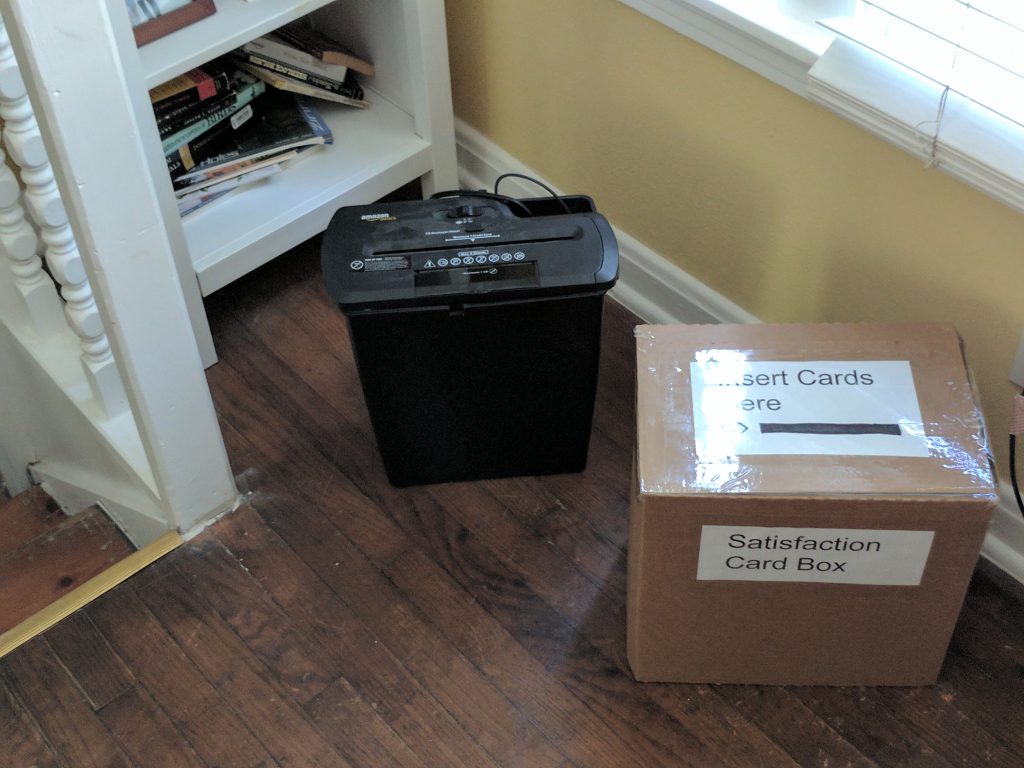 Someone comes out and hands out satisfaction cards. Everyone is instructed to fill them out. When the guests finish, the cards are put into the “customer satisfaction” box, which is revealed to be a shredder.