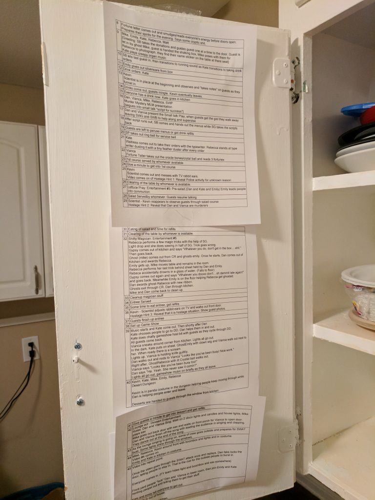 There are too many details of the dinners to write out in one post. These seasons were a monster of a masterpiece and was far and away the most work we had done for a show - even though we reused a lot of the skits and ideas from previous seasons. There were many witty lines, clever timing of lights and sound effects, and great background sounds and music. We had ten different people creating this one - for just 12 lucky guests. It was monumentous in so many ways.
