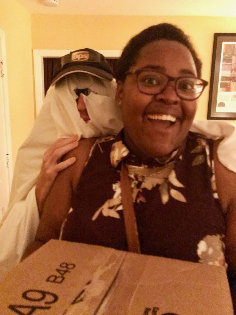 You put the sticker on as the next person enters and receives the box from the UPS ghost.