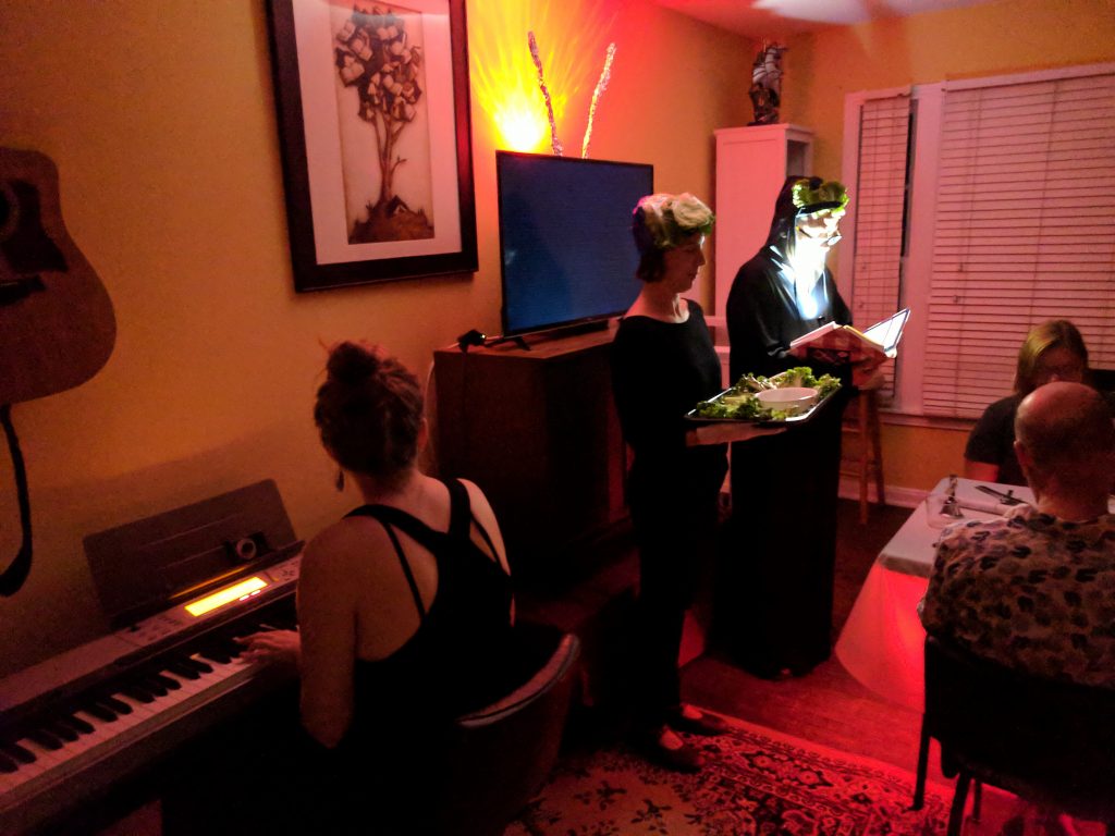The robot was replaced for these dinners. Instead you are met mid-driveway by a stoic, mute, and mostly unresponsive silverware person. When all the guests have arrived, the front door opens and a woman in a gypy costume exits. She lights some sage and walks out to greet the guests.