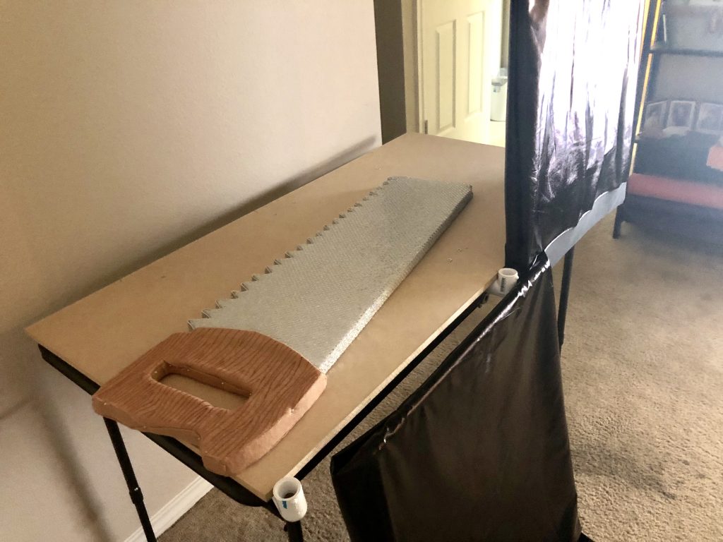 Silverware girl gets into the box and is covered with another shiny cloth. The lights dim and a giant handsaw covered in sequins appears. Dramatic music and the sound of sawing wood fills the room.