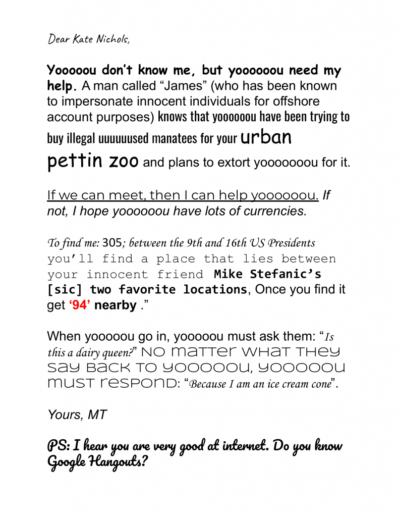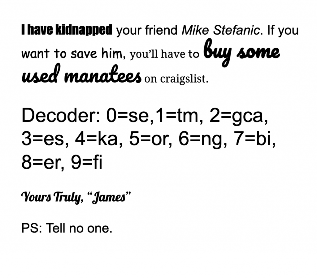 I’ve left information at courier’s office if you want to buy the used manatees. 721 3068 To pick up the package you must ask them: “Is this a dairy queen?” Yours Truly, “James” (Dairy Queen is also sort of an inside joke with our group. But asking whether a place is a Dairy Queen is not.)