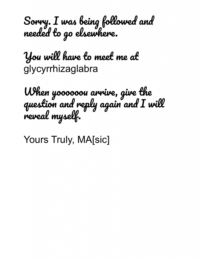 My friends get back to their cars and there’s a note on the dashboard about me being kidnapped. (At this point they all confess they knew I was going to be there.) Here is the note: