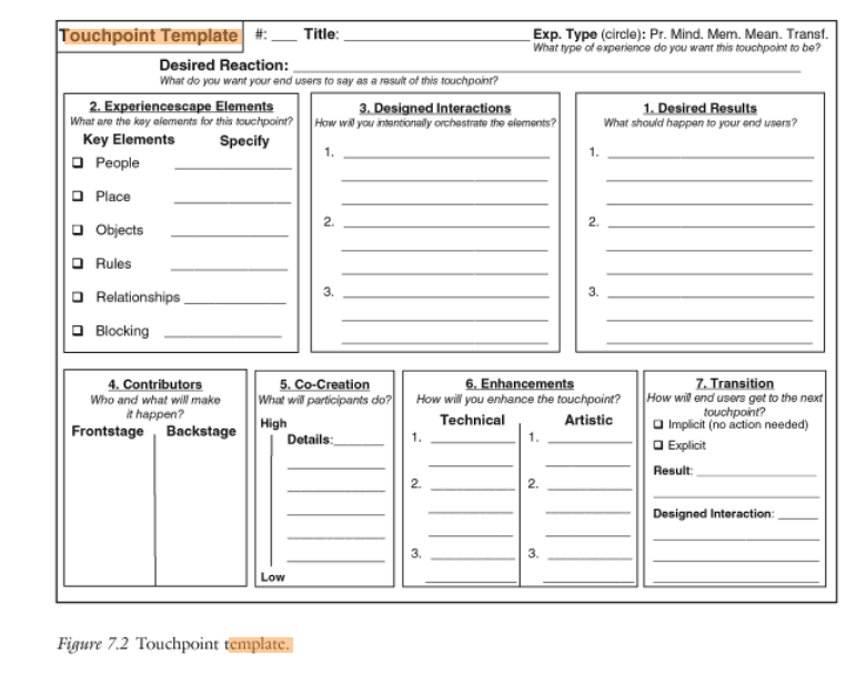 First, what is the Touchpoint Template? It’s Duerden and Rossman’s model of a touchpoint. A touchpoint is a specific interaction someone has with your experience. It inclues the people, places, and things involved in the interaction, the desired interactions and results and some other elements describing the experience. It gives you a a complete picture of the experience.