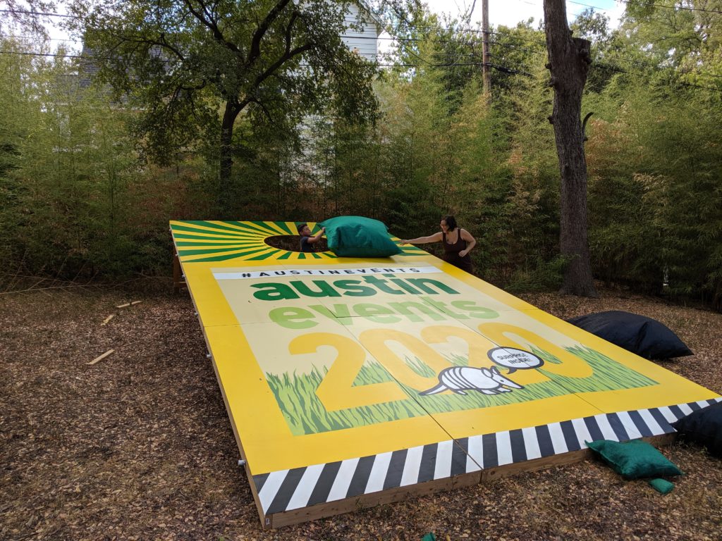 I made a 300 sq foot cornhole game as a promotional tool for my calendar company, Big Weekend Calendars. It was part of an experimental event series I did for the (soon-to-be-a-lot-less-useful), Austin Events 2020 wall calendar.